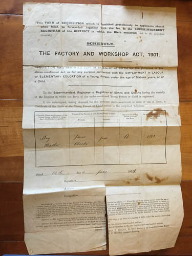 The certificate in the photograph is confirmation that the details of May Harker’s birth on the back are correct. This was required because May was starting work aged 14 years in Anson Brothers Factory. Section 134 of the Factory and Workshop Act 1901required that proof of age was provided.